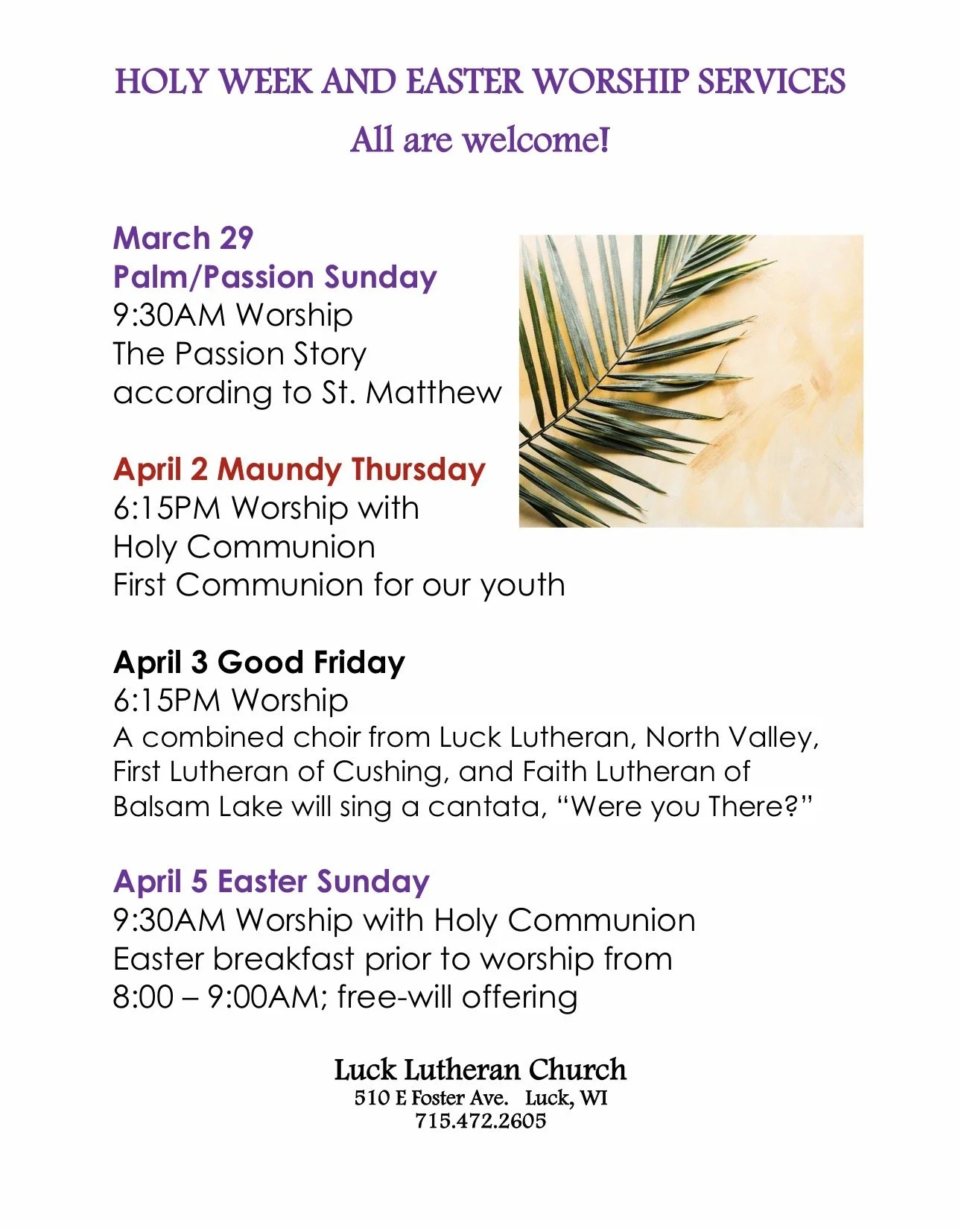 We look forward to meeting you and sharing what God is up to at Luck Lutheran.